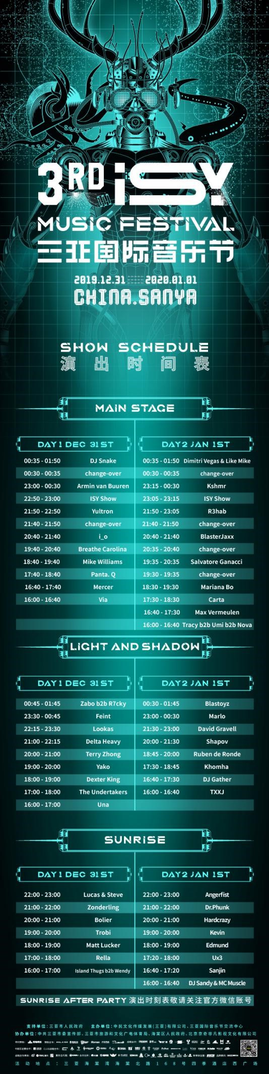 截至目前,ISY3.0已经集结了超过50余位大咖艺人,汇集了最新百大DJ排行榜上的顶尖大咖。ISY将通过沉浸式的视听体验,邀请世界顶尖厂牌Monstercat与世界顶级的Trance领域制作人合作;并且与全球最大的电子音乐厂牌Spinnin' Records与Hardstyle领域的制作人联手,邀请多位在EDM、Trance、Hardstyle等多种风格的代表DJ出演,汇聚多元艺术形态,不仅打造最纯正的电子音乐现场,更是属于电音乐迷的跨年狂欢。