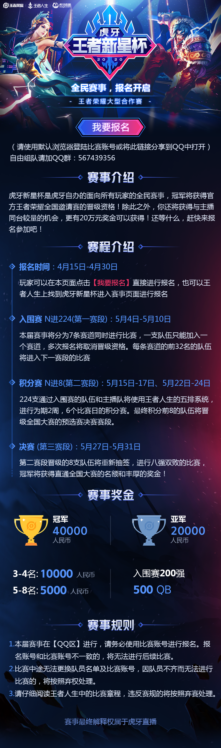 虎牙新星杯是虎牙自办的全民赛事,冠军可以获得官方王者荣耀全国邀请赛的晋级资格!更有20万大奖等你来拿!