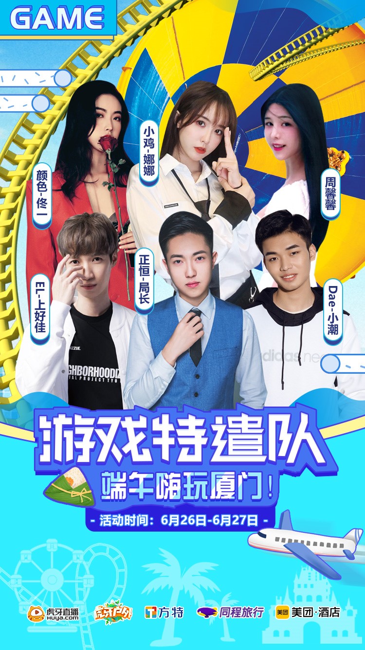 虎牙游戏特遣队是虎牙直播为了疫情期间端午假期出游成立的吃喝玩乐嘉宾团,由户外人气主播局长、王者荣耀国服第一橘右京上好佳、国服全能射手小潮、美女主播佟一、娜娜、周馨馨共同组成。端午节期间,主播们来到厦门方特,足不出户带你“云游玩”,第一视角体验城市主题乐园,360度无死角直播,即便是在家也能感受到逛游方特的快乐!