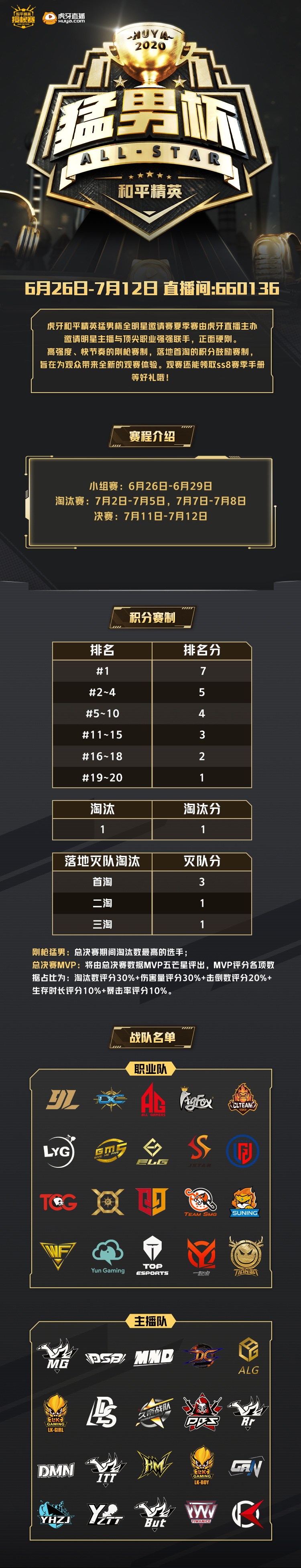 备受期待的虎牙和平精英猛男杯夏季赛将于6月26日正式拉开序幕,20支国内顶尖职业战队、20支明星主播战队已经正式集结完毕,刚猛主播与职业硬汉或强强组队,或针锋相对,终极较量一触即发,你准备好前来助阵了吗!