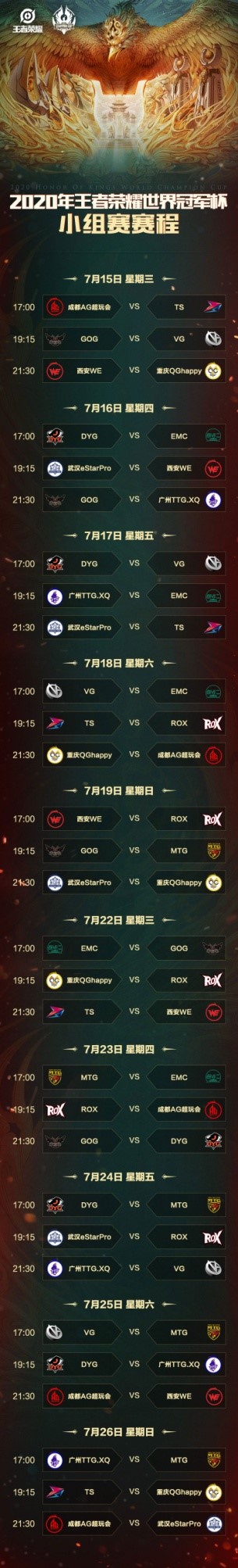世界冠军杯主赛事分为小组赛和淘汰赛,小组赛于7月15日-7月26日进行,其中7月20日-22日为休赛日。淘汰赛部分的四分之一决赛将于7月30日-8月2日进行,半决赛于8月8日-8月9日进行,最终的总决赛将于8月16日进行!