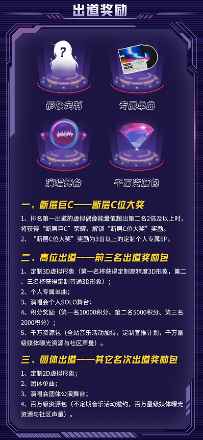 制定3D虚拟形象+个人专属单曲+演唱会个人solo舞台+积分奖励+千万资源包+3首以上的定制个人专属EP