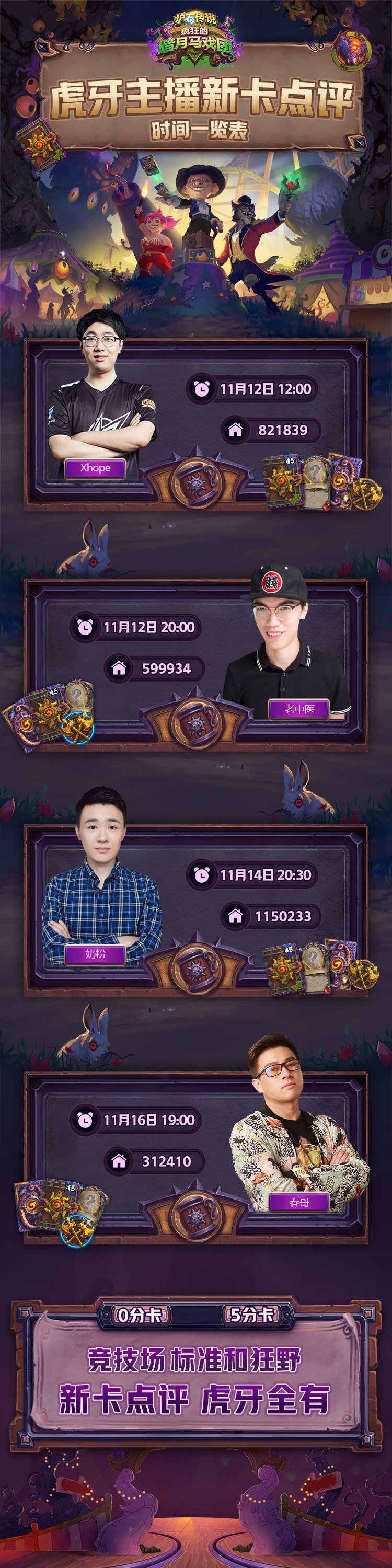请期待各位主播带来的精彩新卡点评,11月18日,新版本“疯狂的暗月马戏团”即将来袭,锁定虎牙炉石专区,看直播评新卡!
