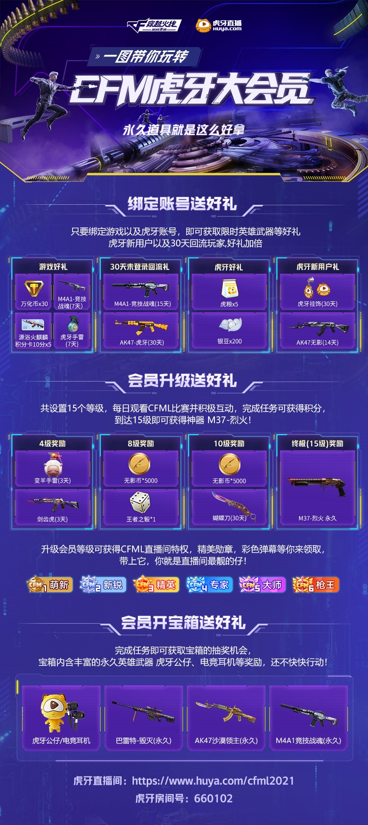 CFM虎牙大会员又来啦,本次大会员成长体系奖励升级,在游戏活动页面内绑定会员就有限时英雄武器领取,升级会员更有永久M37烈火赠送以及超炫酷的勋章和彩色弹幕!会员抽奖的奖励也很丰富!各位CFer们快来参与吧!