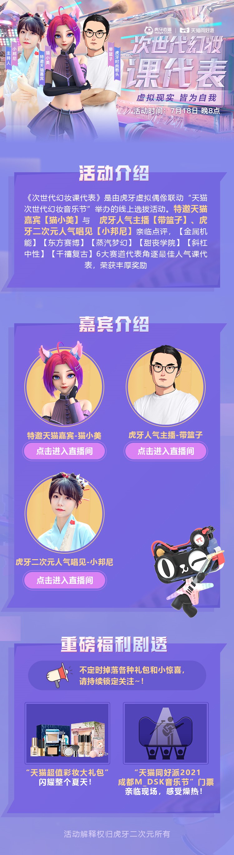 7月18日晚8点,天猫次世代幻妆当红虚拟偶像「猫小美」与虎牙人气主播「带篮子」、虎牙二次元人气唱见「小邦尼」将在《次世代幻妆课代表》的活动中梦幻联动~!