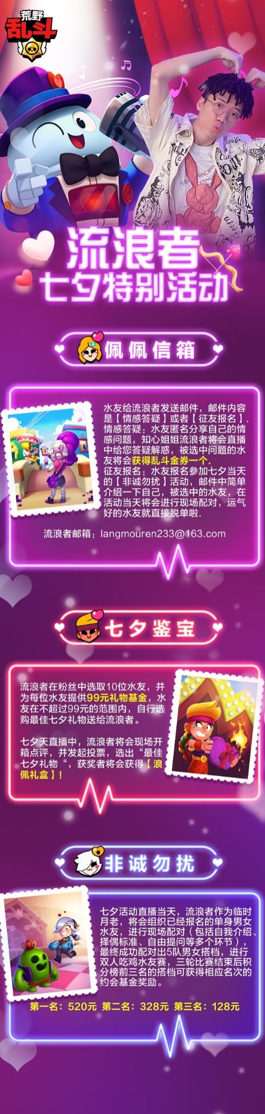 作为荒野乱斗专区的明星主播,流浪者不仅游戏技术过硬,还是一个看透红尘的情感达人,这次七夕节,流浪者为大家准备大量乱斗金券、现金红包、还有个人周边,话不多说,上才艺!