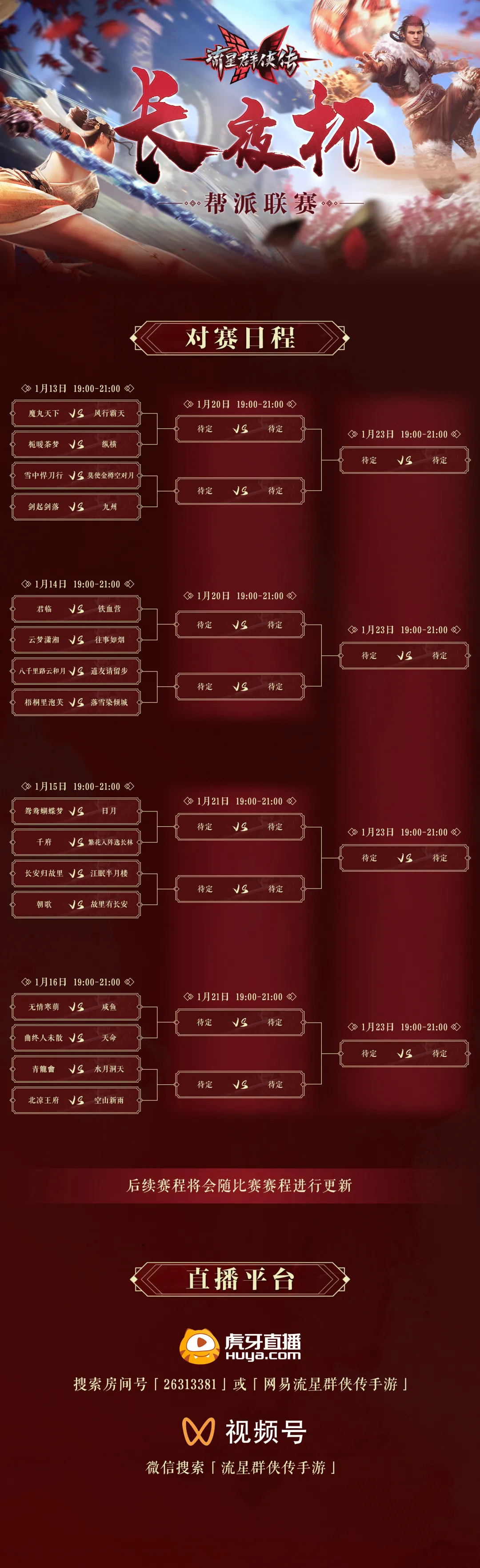 1月13日晚19点,流星群侠传长夜杯帮派联赛正式开战!32支实力帮派队伍将开启征程,争夺最强帮派的桂冠!