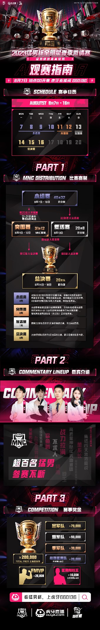 更多精彩尽在08月07日-16日 晚18:00虎牙和平精英2023猛男杯全明星夏季赛,搜索660136房间号为你心目中真正的猛男加油助力,期待猛男冠军的诞生!
