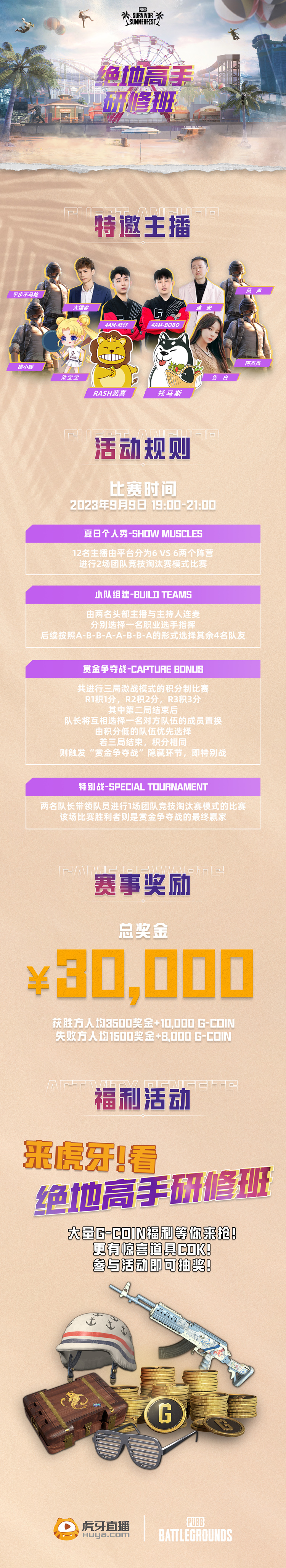 虎仔们注意啦!虎牙《绝地高手-修研班》即将在9月9日闪亮登场!悲喜、托马斯及其他10名PUBG头号主播将与大家激情互动!更有大量G-coin、游戏道具CDK惊喜放送!