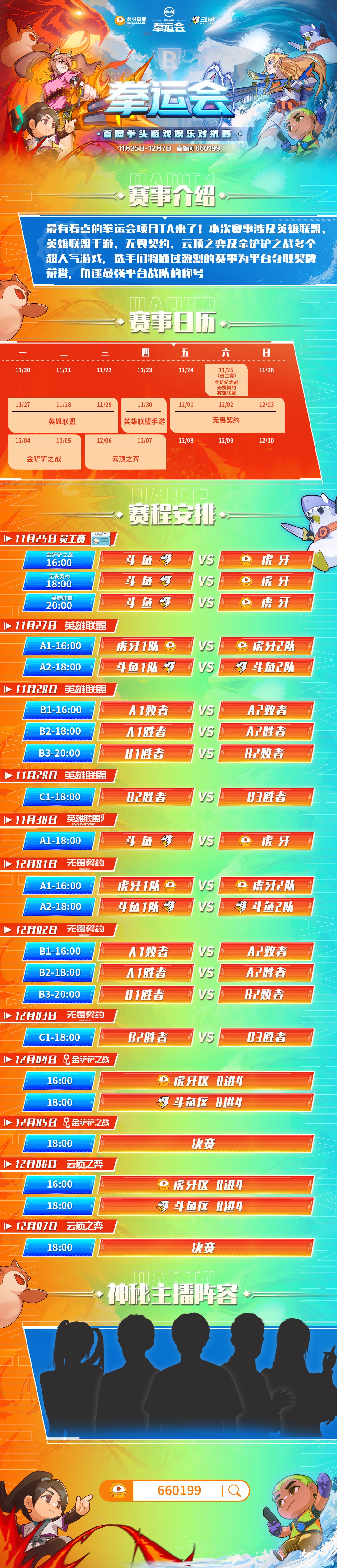 本届“拳运会”赛事是由虎牙直播与斗鱼直播共同发起的平台对抗赛,包括英雄联盟、英雄联盟手游、无畏契约、云顶之弈及金铲铲之战在内多个人气游戏将展开为期12天的激烈比赛,选手们将代表平台出战,角逐最强平台战队/主播的荣誉。