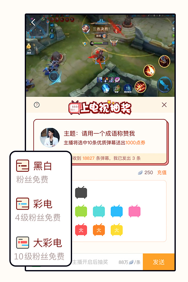 上电视是一种直播间弹幕抽奖互动玩法,拥有该主播粉丝徽章的观众可免费参加抽奖。
