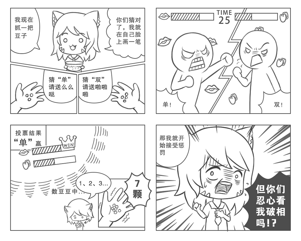 玩法: 开启2分钟礼物投票,投票项写单/双,主播抓一把豆子,观众送么么哒/啪啪啪投票,投票计时结束后,获胜的投票项代表观众选择,如观众猜中则主播接受惩罚或表演才艺。