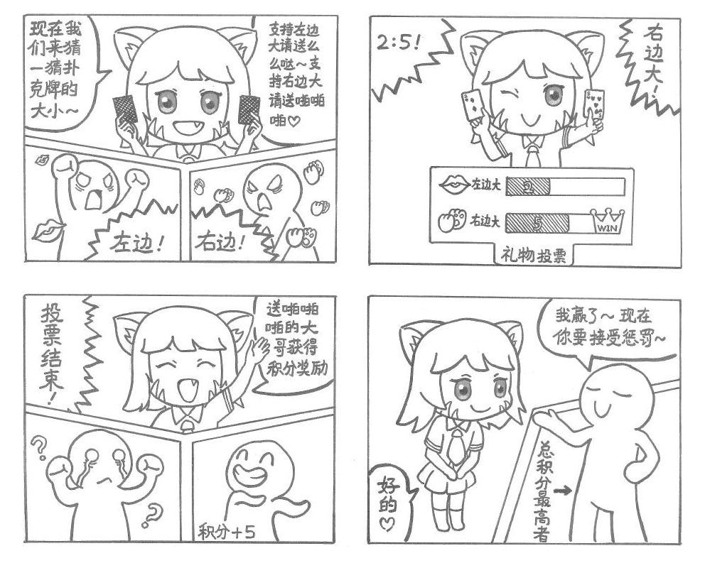如猜对,则投票者获得送出啪啪啪或者么么哒数量相对应的分数,猜错不得分。三局后,分数多的用户可以让主播表演节目。